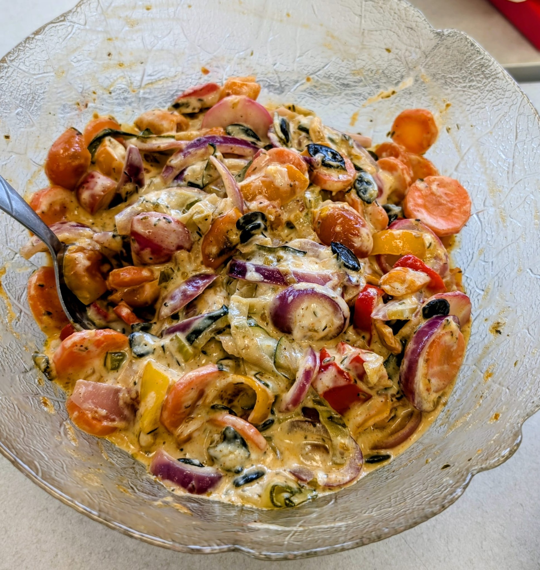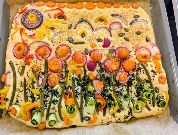 Auf dem Menü standen ein liebevoll gestalteter Focaccia Garden, ein frischer Tortellini-Salat und ein New York Cheesecake im Glas. Und weil noch so viele Zutaten übrig waren, haben wir spontan improvisiert: Es entstand zusätzlich ein duftendes Naan-Brot und aus dem restlichen Gemüse eine bunte Gemüsepfanne.